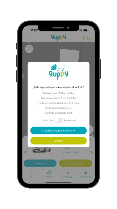 Si quieres finalizar en otra provincia guppy distinta a la del inicio, en tu alquiler te parecerá el extra interprovincial, excepto si con el vehículo guppy con el que viajas es de la provincia destino. Consulta en la app las tarifas del vehículo antes de iniciar tu alquiler tu guppy.